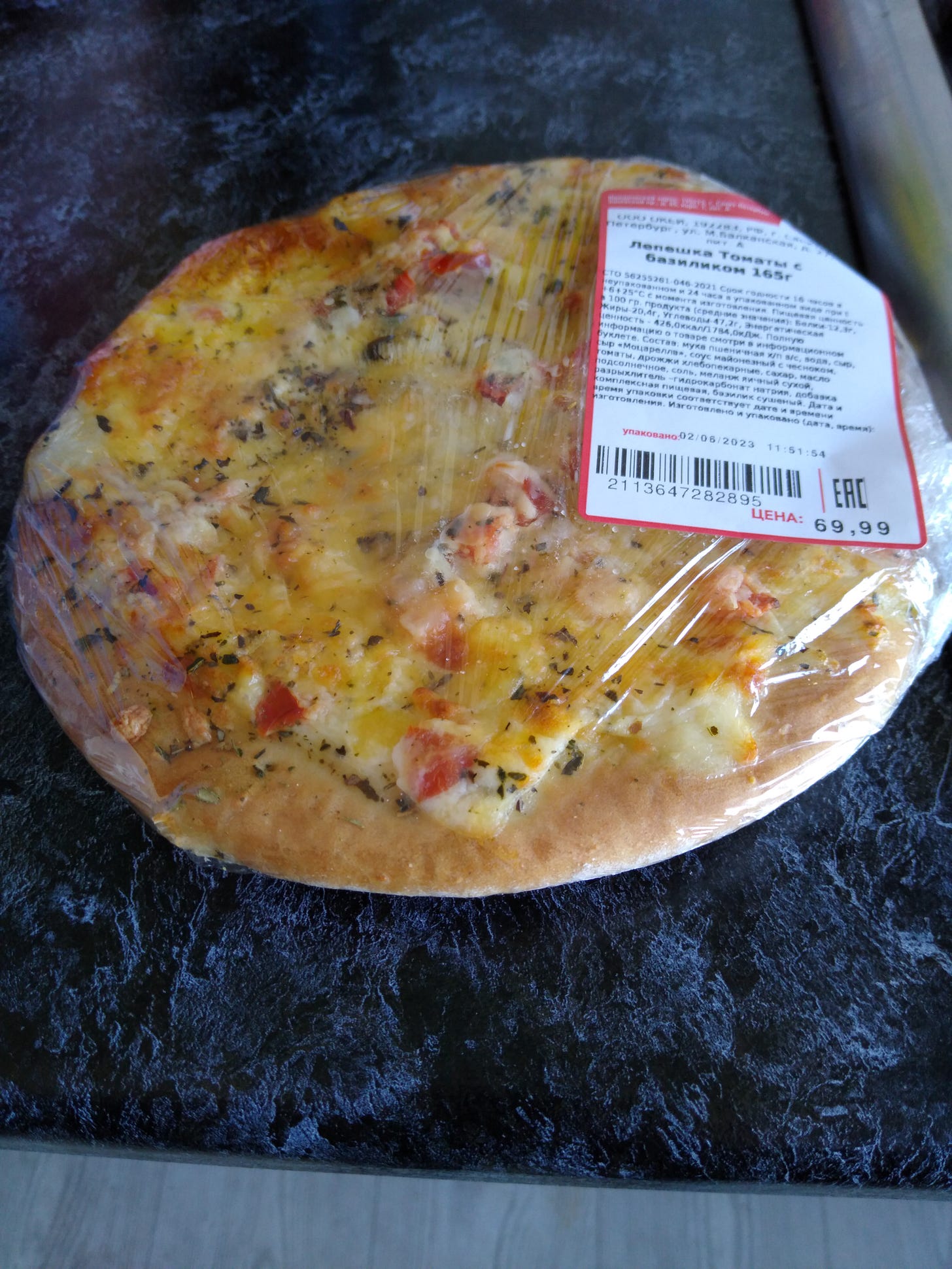 That's a lot like a personal pan pizza or foccaccio (Russians call this flat piece a bread lipyoshka, but this one has cheese, tomato, and basil on it). It can be had for about 80 cents in another grocery store we visited yesterday.