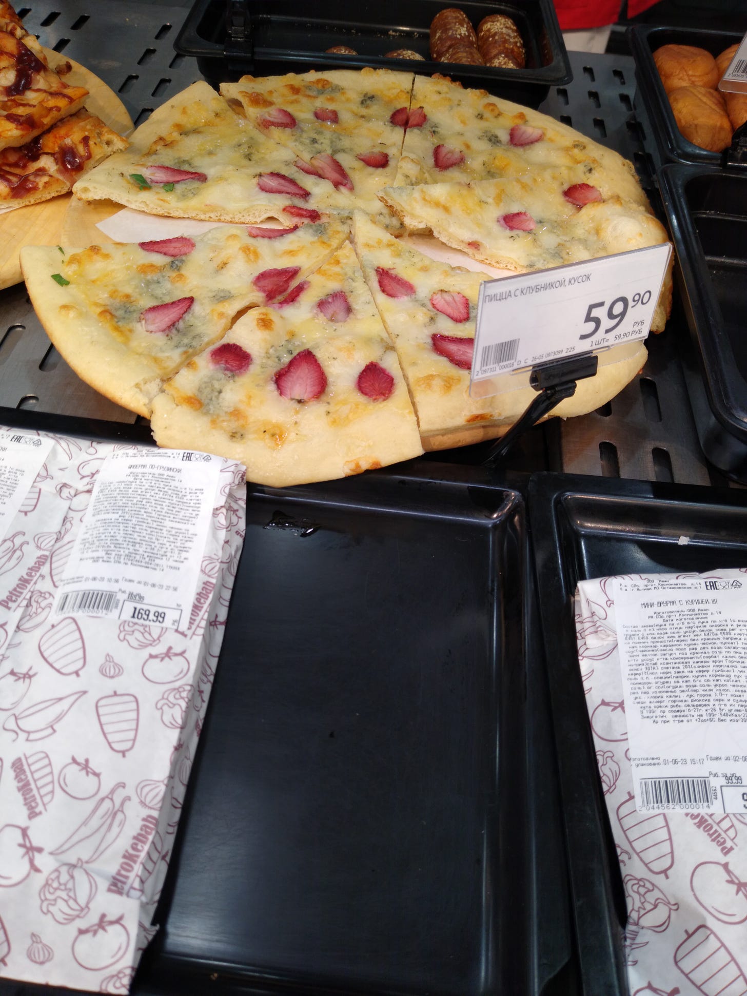 Finally, I leave you with the following unsettling photograph. Yes, that is a pizza with strawberries on it. The ones they previously sold in this deli had slices of pear on them. This is a violation of everything I hold sacred about pizza so I obviously did not try it. I guess maybe it could be viewed as a lesson in cultural (mis?) appropriation, like the baked sushi they sell at some places here in Russia, sometimes even made with chicken or beef.